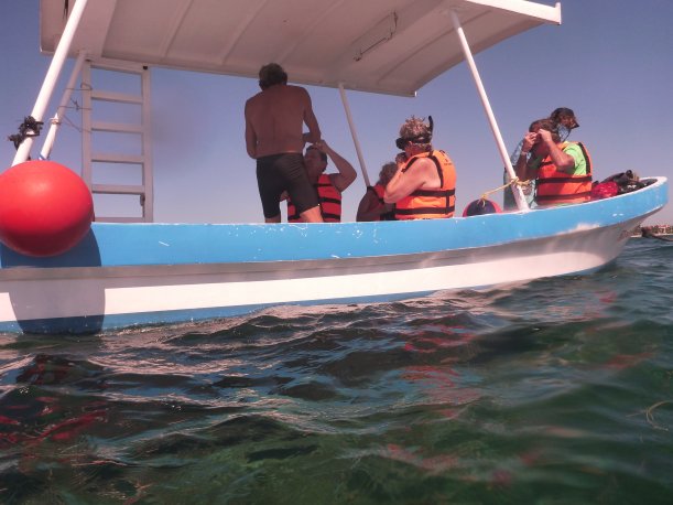 Planned to snorkel and film the reef. Its windy this morning. Arrived at the pier, not sure about going out…. but I has my gear, was slathered with reef friendly suncreen. So hey why not. Visability made filming imposible, so another day for that.We picked up 2 teachers from Seattle at their place.