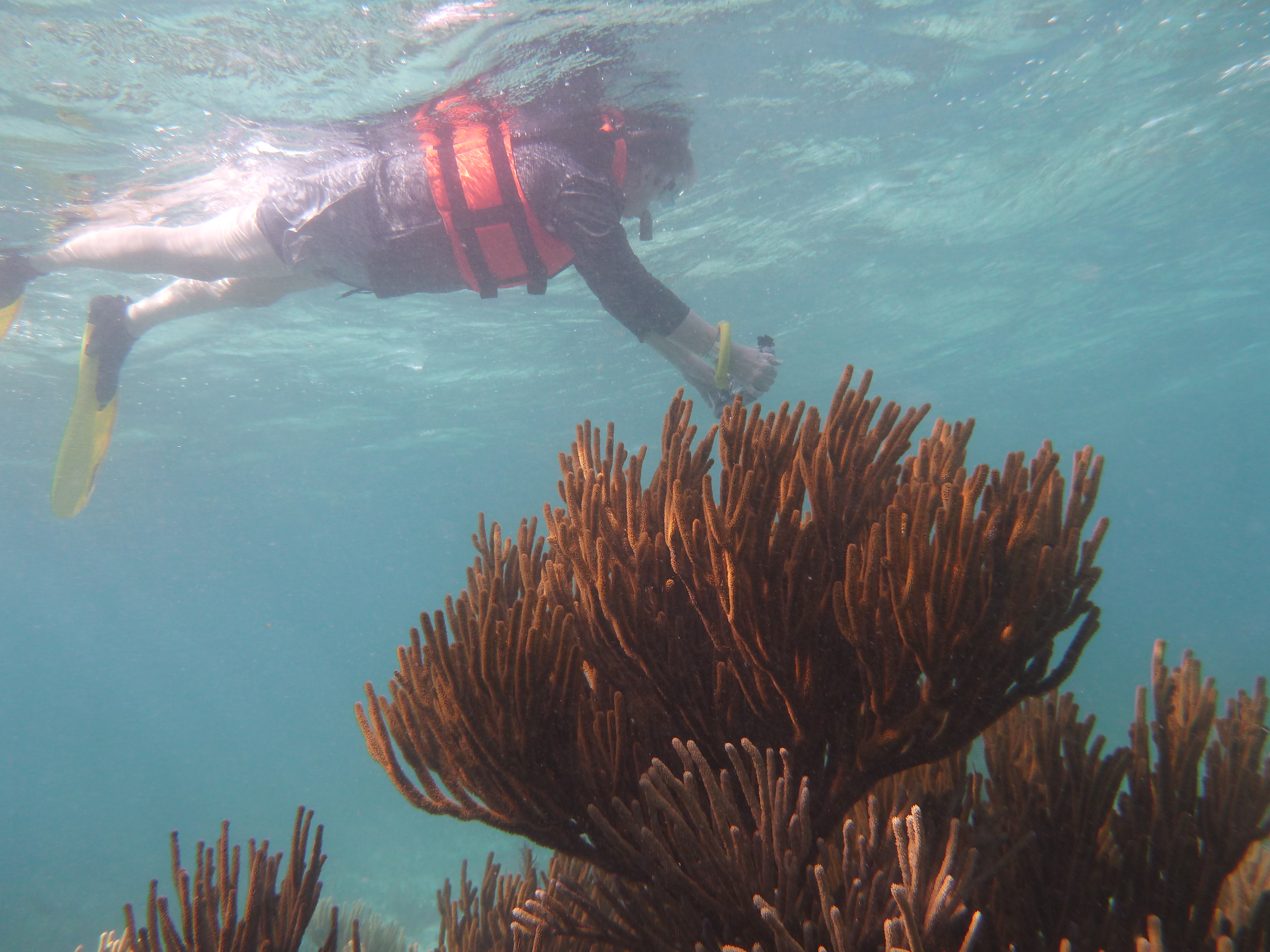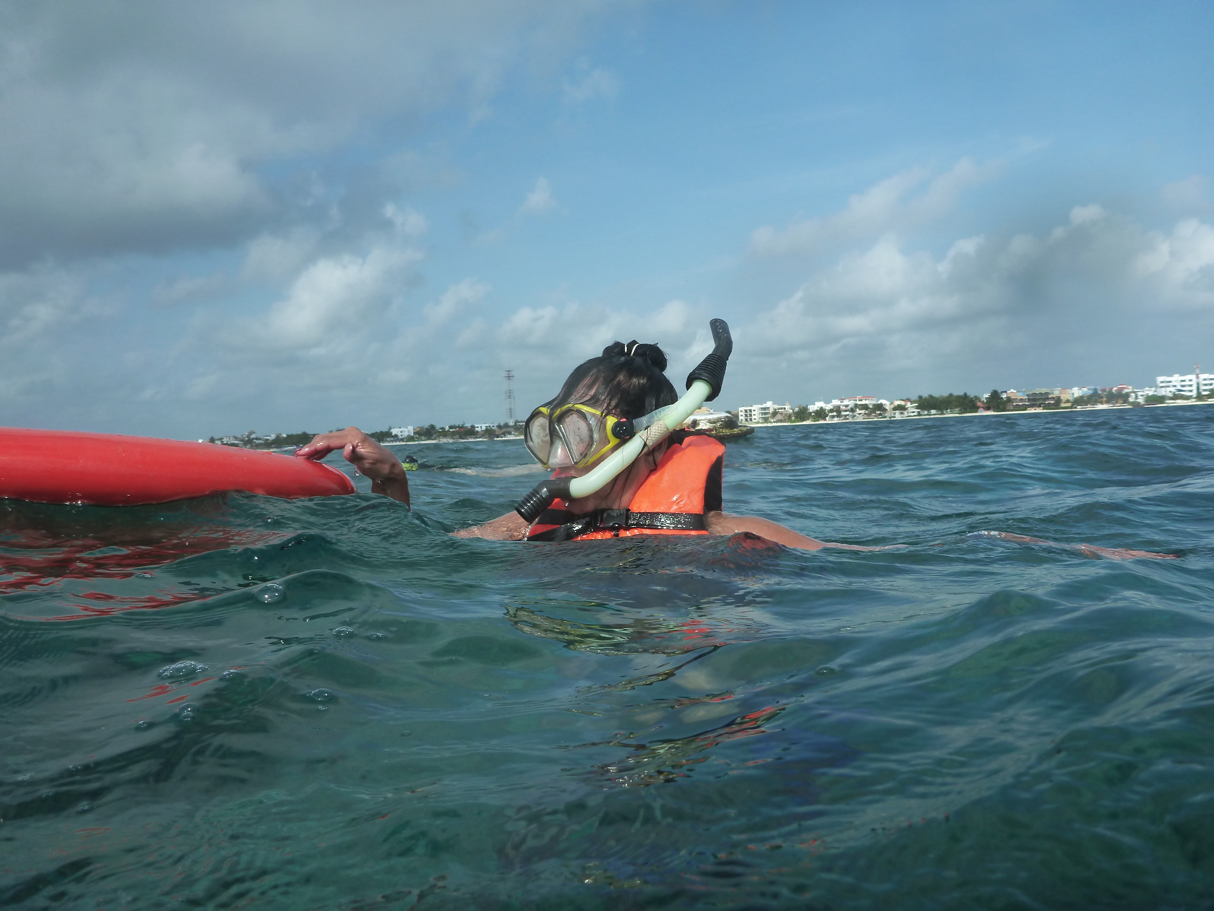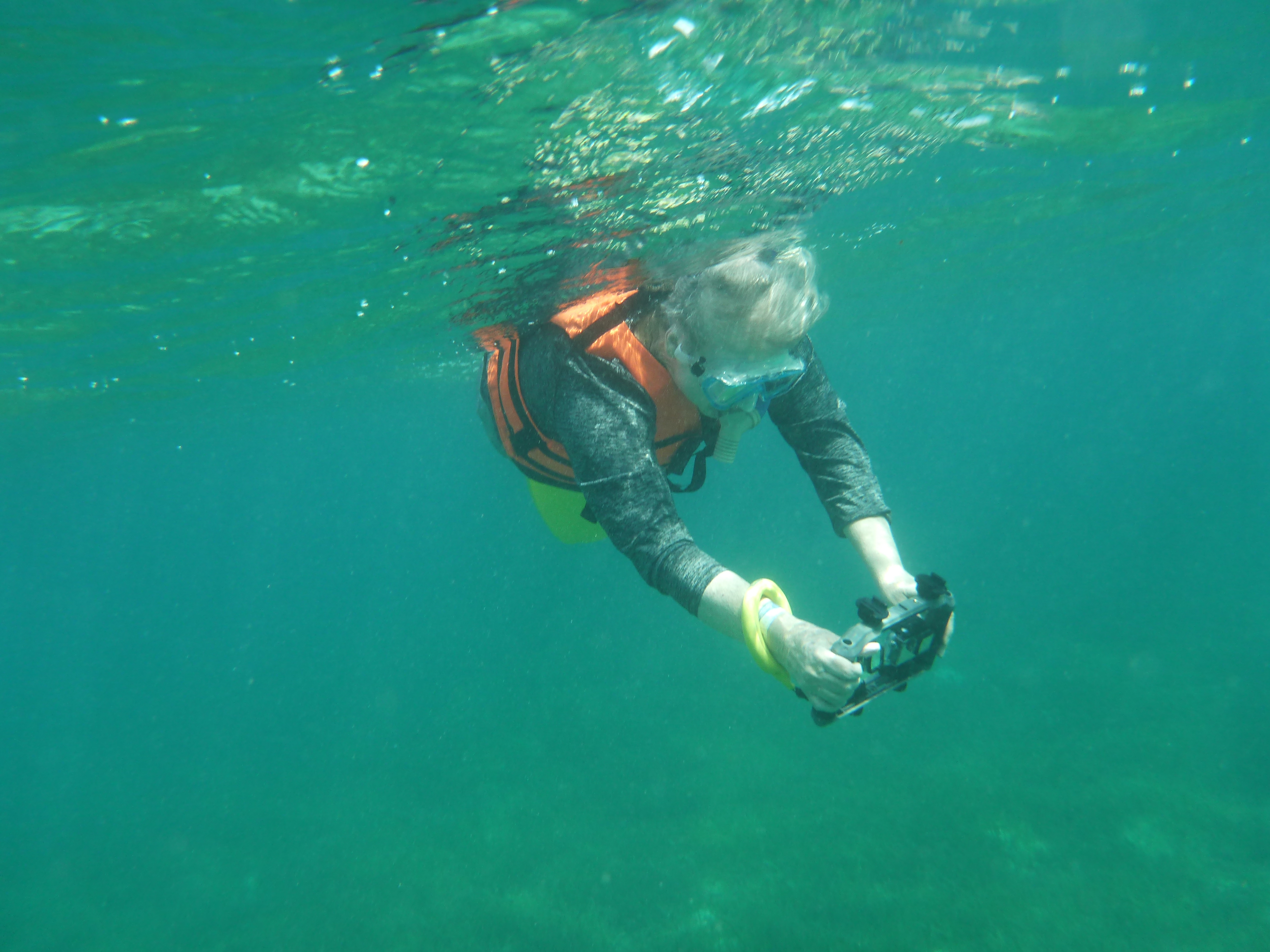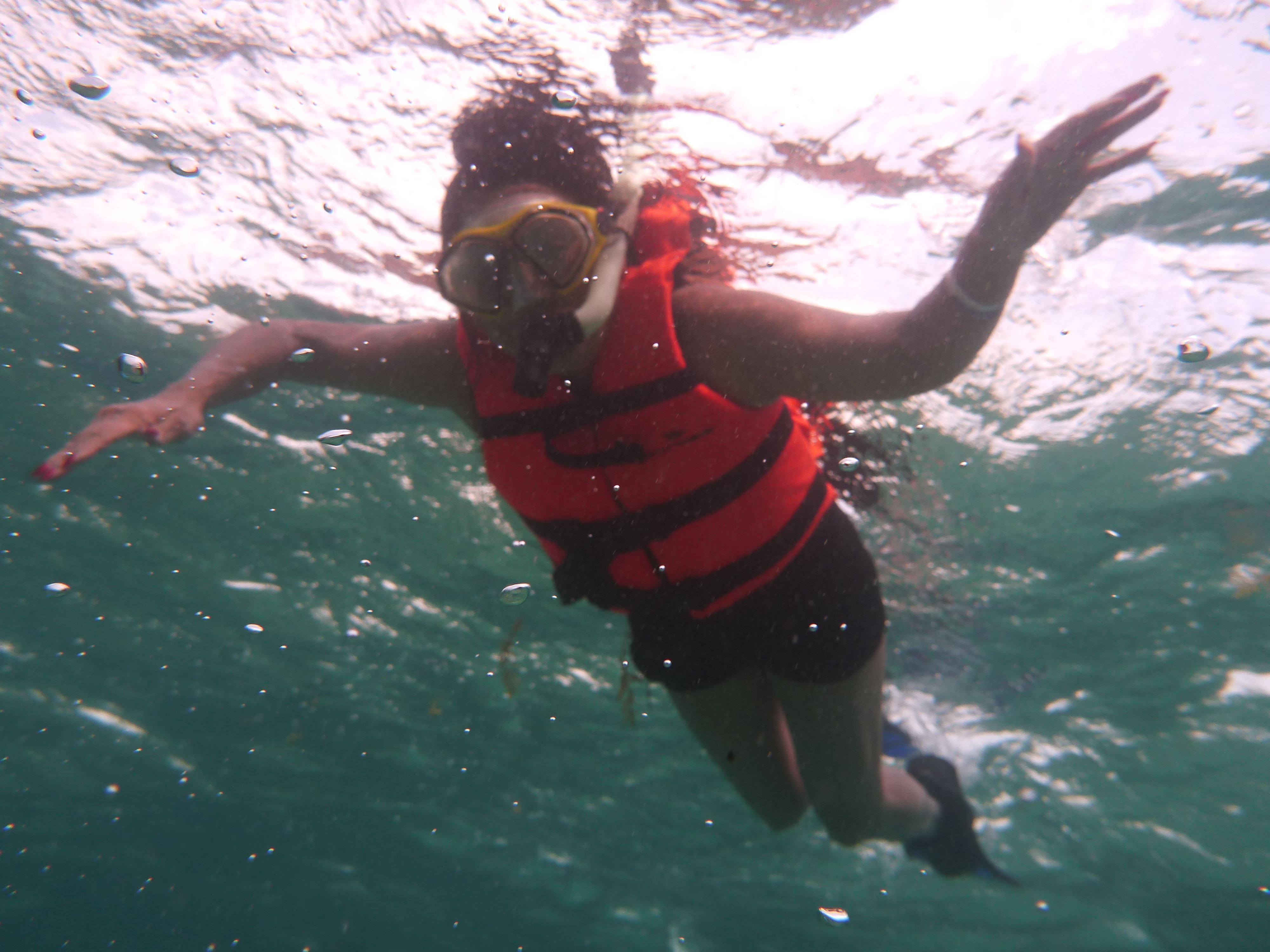It’s windy, choppy, and the swimming against the current was rough. We’d swim up to the reef but the current pushed us away back to the eel grass. Orie did really well. She hung onto the life preserver and the divemaster pulled her around. It was great, most first time snorkelers have problems breathing through the snorkel. She mástered it.