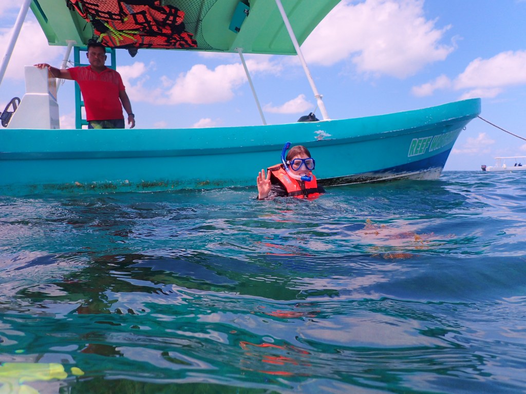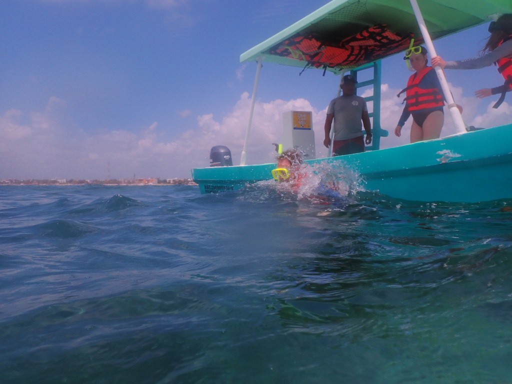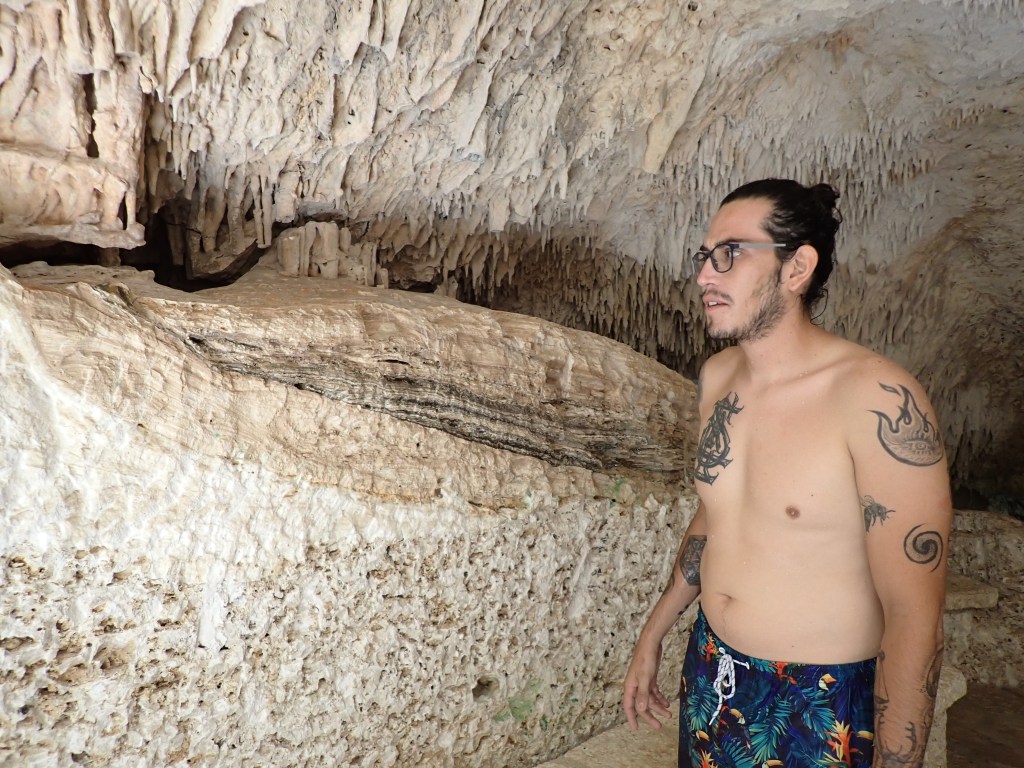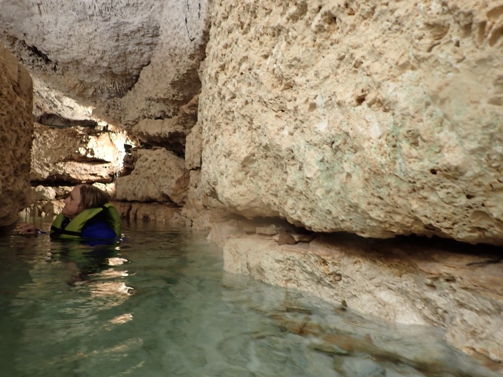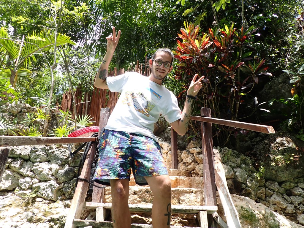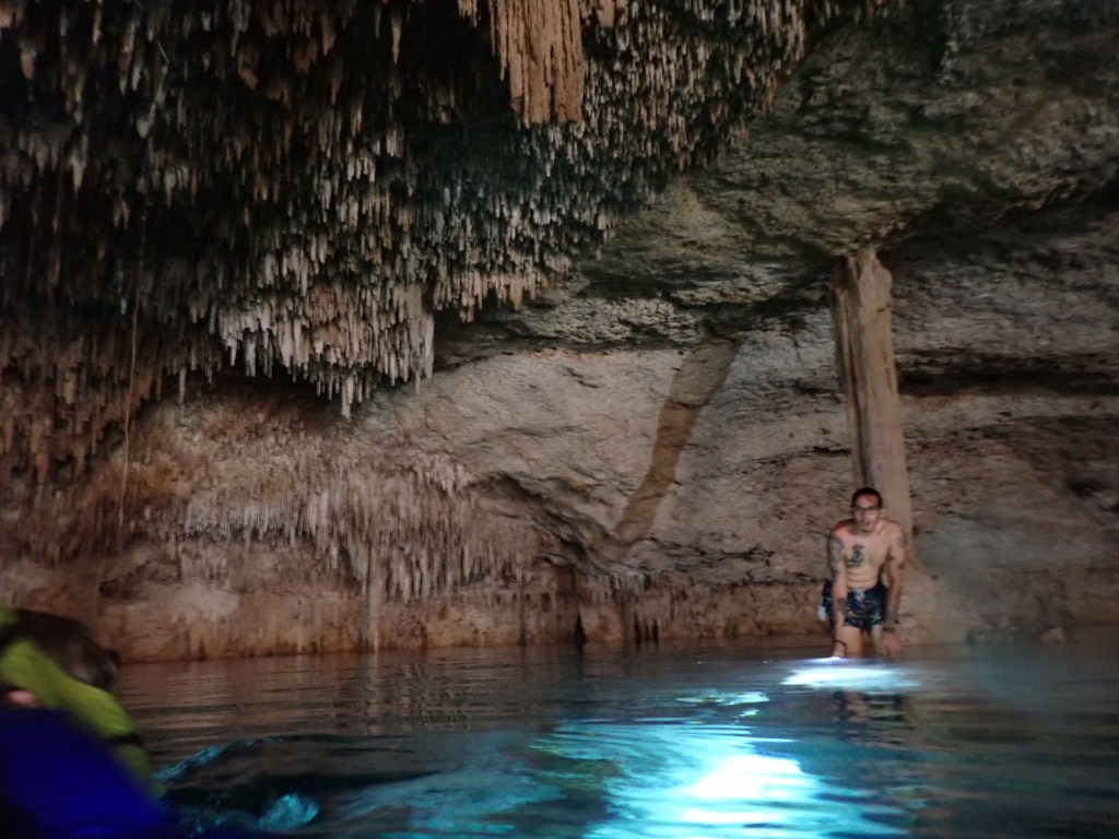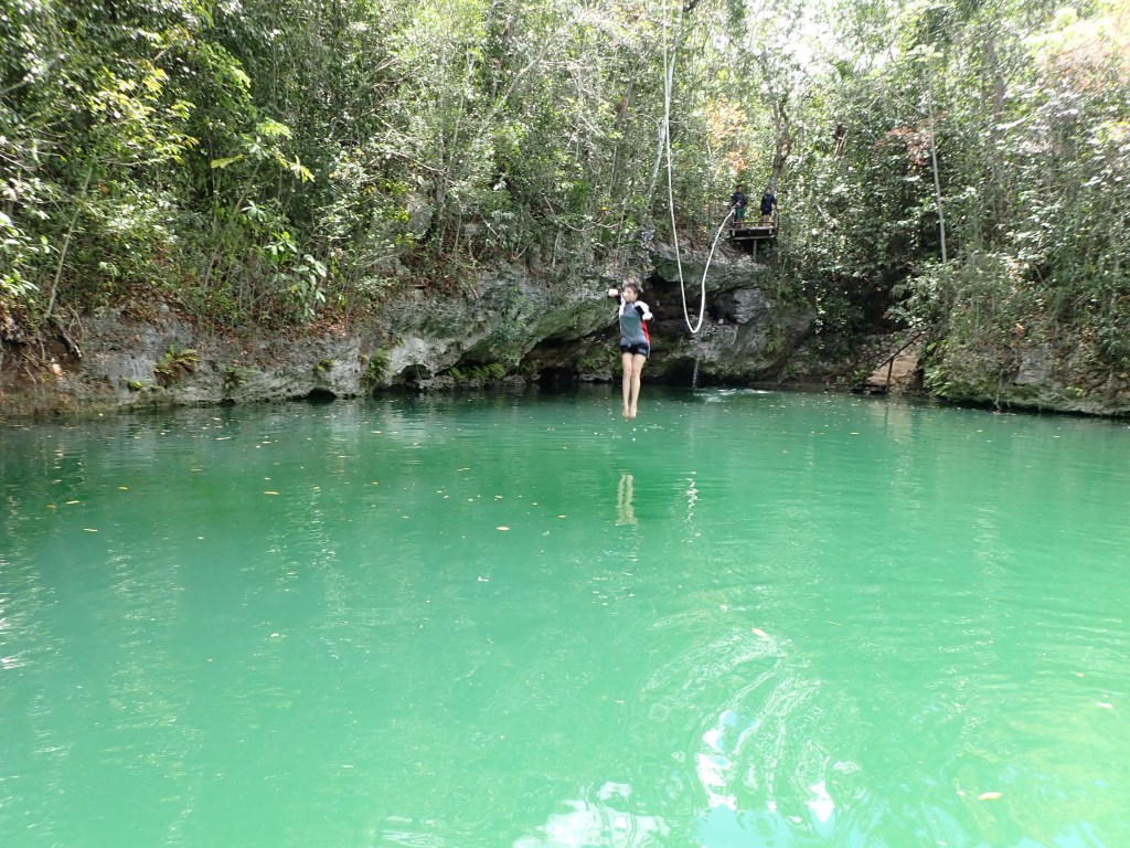 The next cenote was open. It had a Zip line! I was expecting a little chair like place to sit while Zip lining over the top of the cenote. BUT, actually it consisted of…is a was a line over the cenote, you hold onto a bar, swing out over the cenote, when Sebastian yells “drop”, you let go of the bar! Fall into the cenote from about 20 ft.