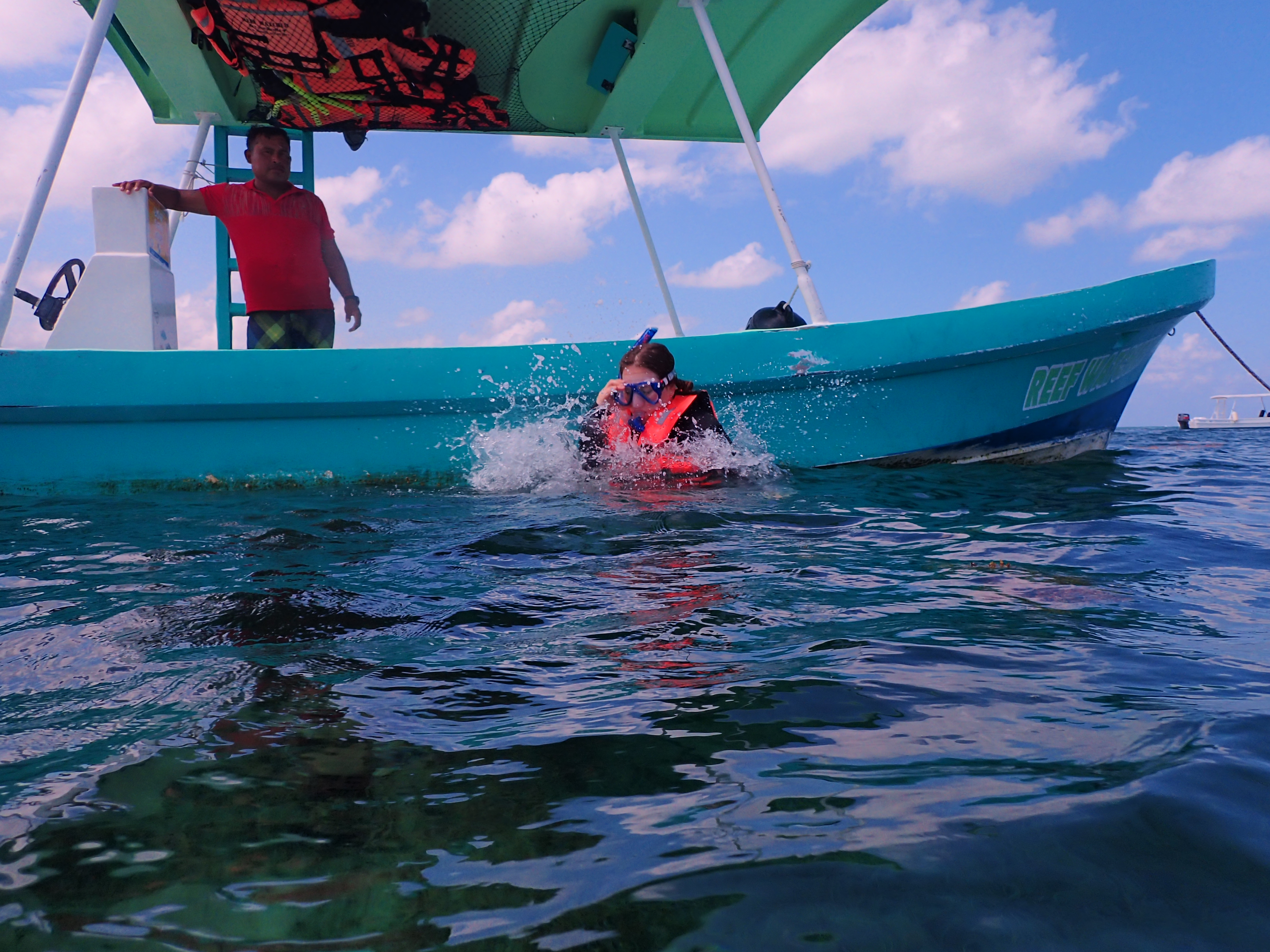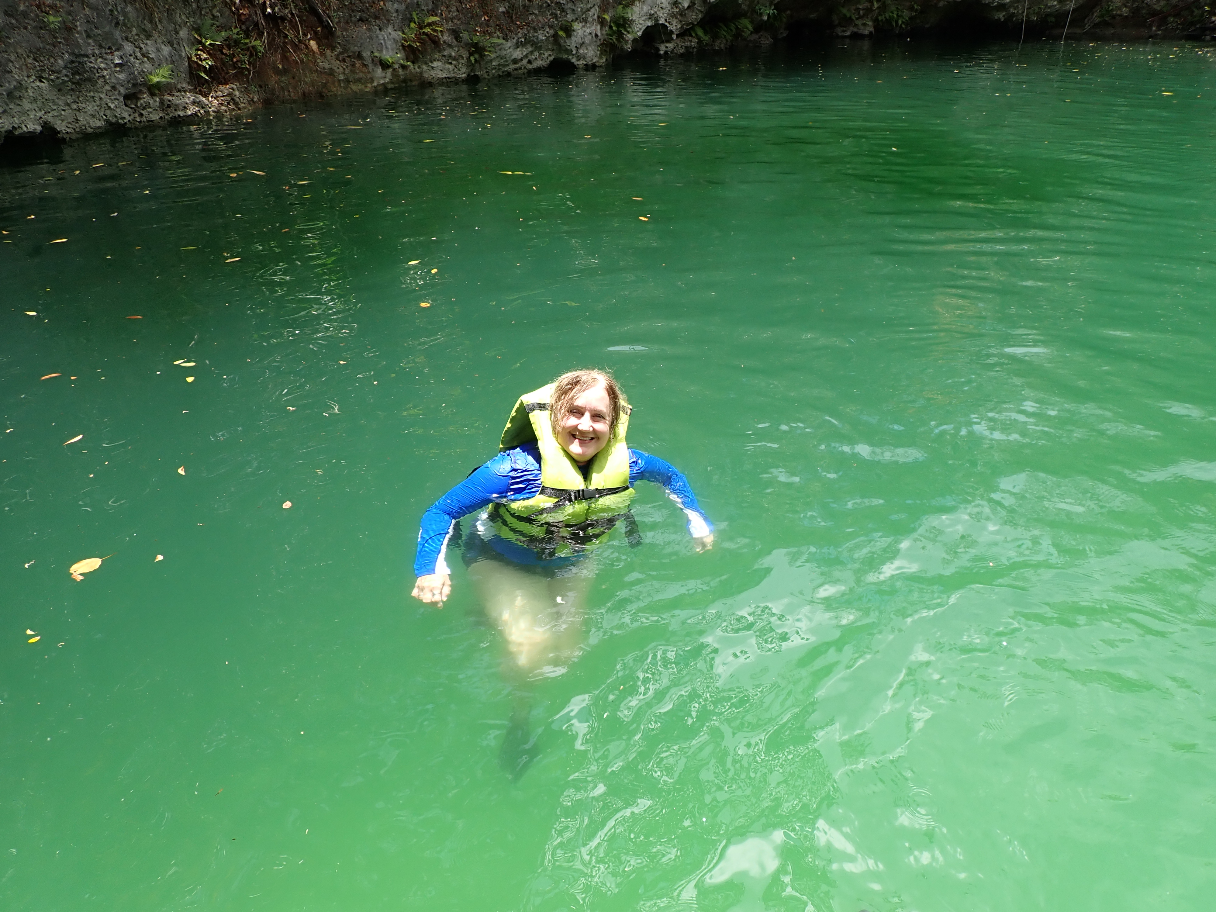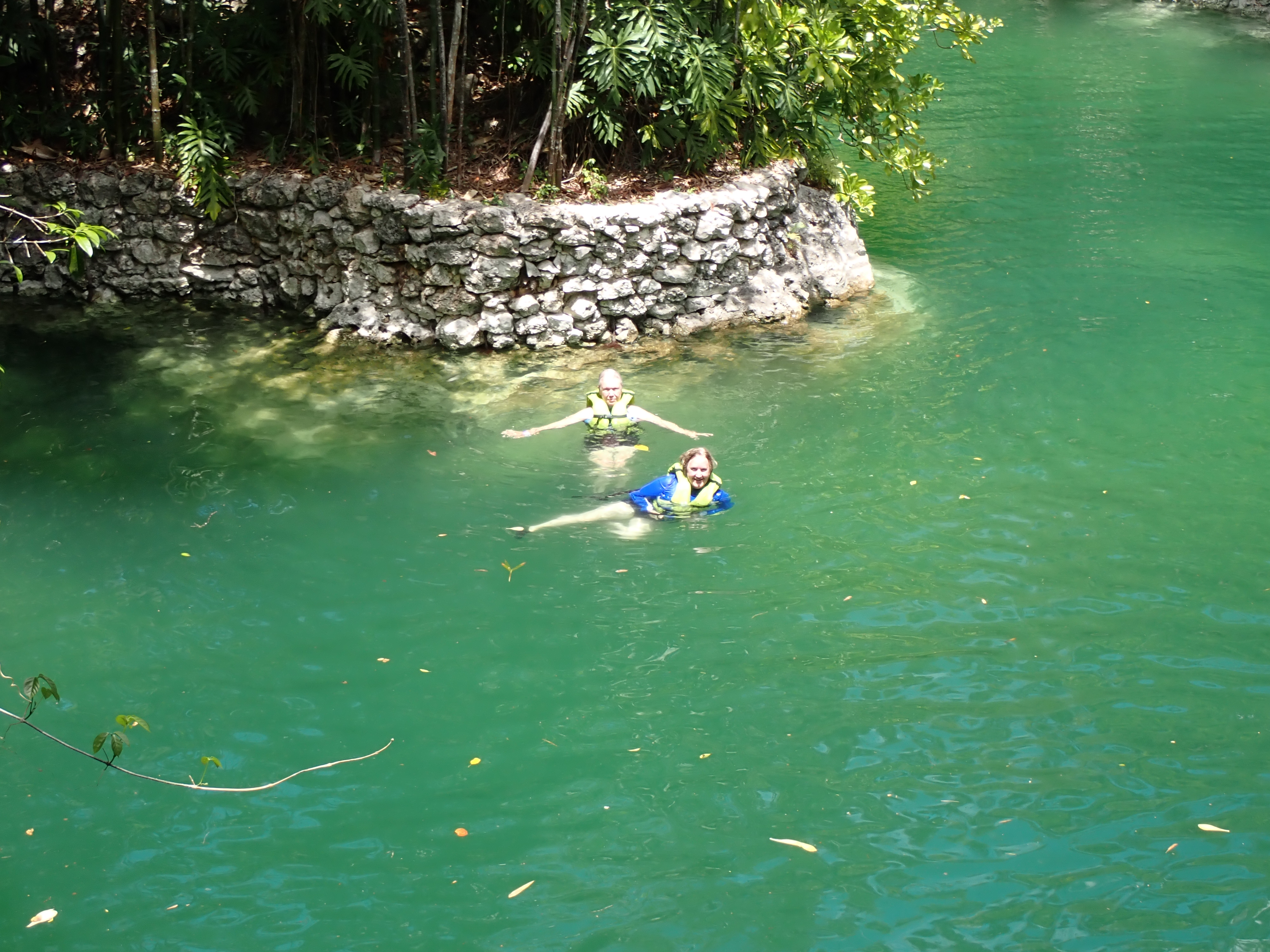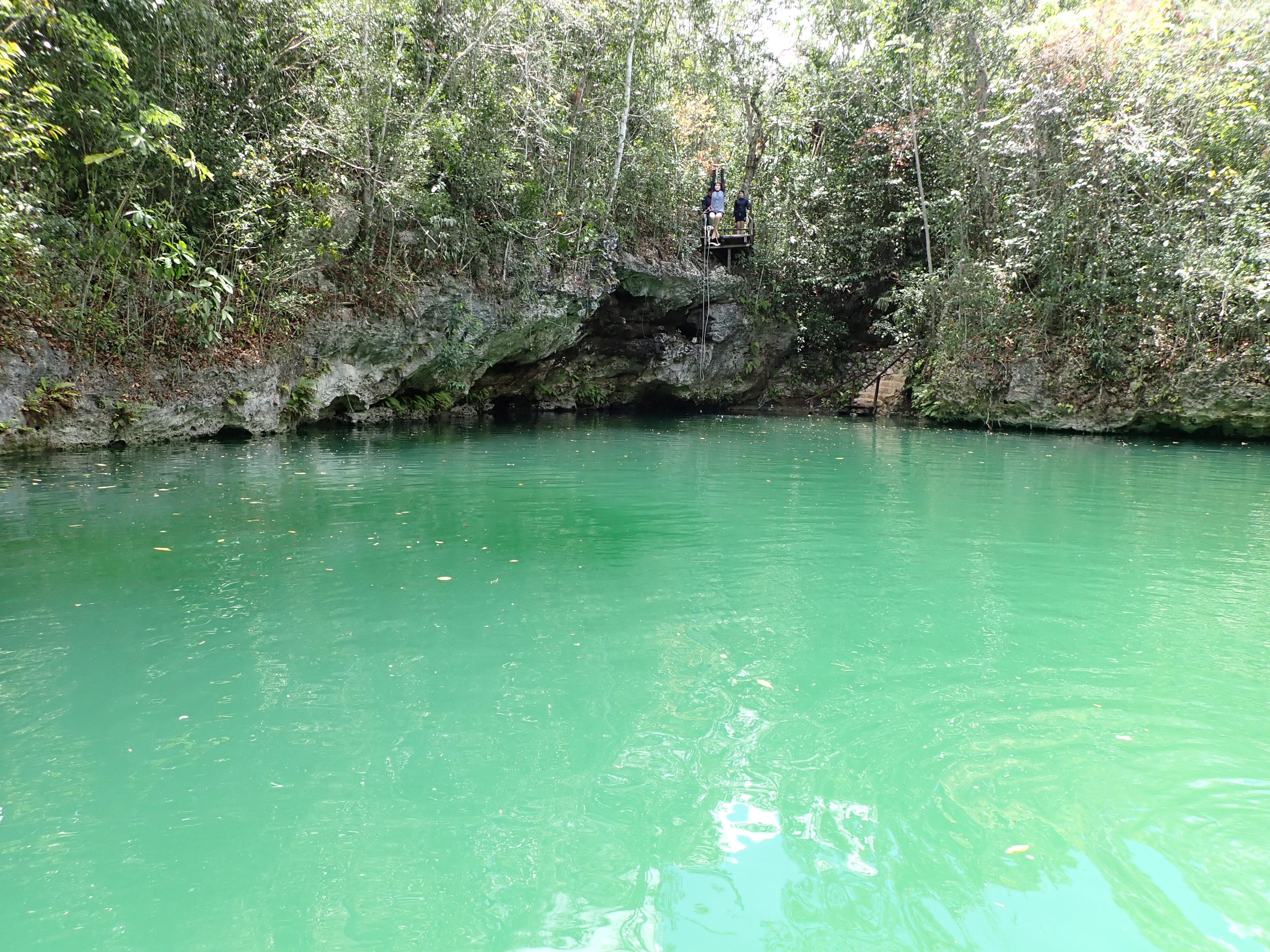 The next cenote was open. It had a Zip line! I was expecting a little chair like place to sit while Zip lining over the top of the cenote. BUT, actually it consisted of…is a was a line over the cenote, you hold onto a bar, swing out over the cenote, when Sebastian yells “drop”, you let go of the bar! Fall into the cenote from about 20 ft.
