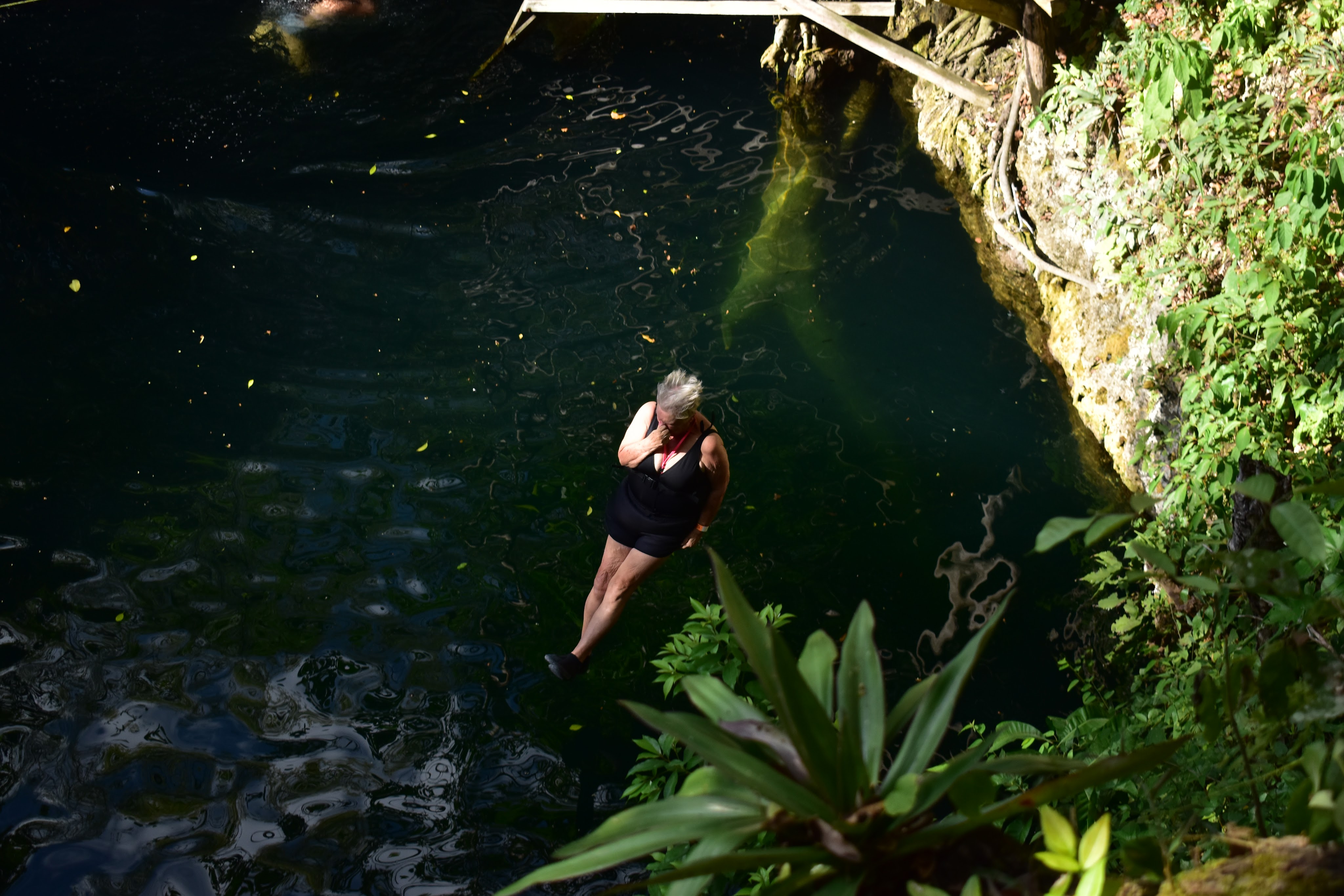 This log across the opening was where you may jump into the water. After watching a few people jump, all young I might add. I jumped. The scariest part was walking over to the place to jump in middle of that log over the cenote.