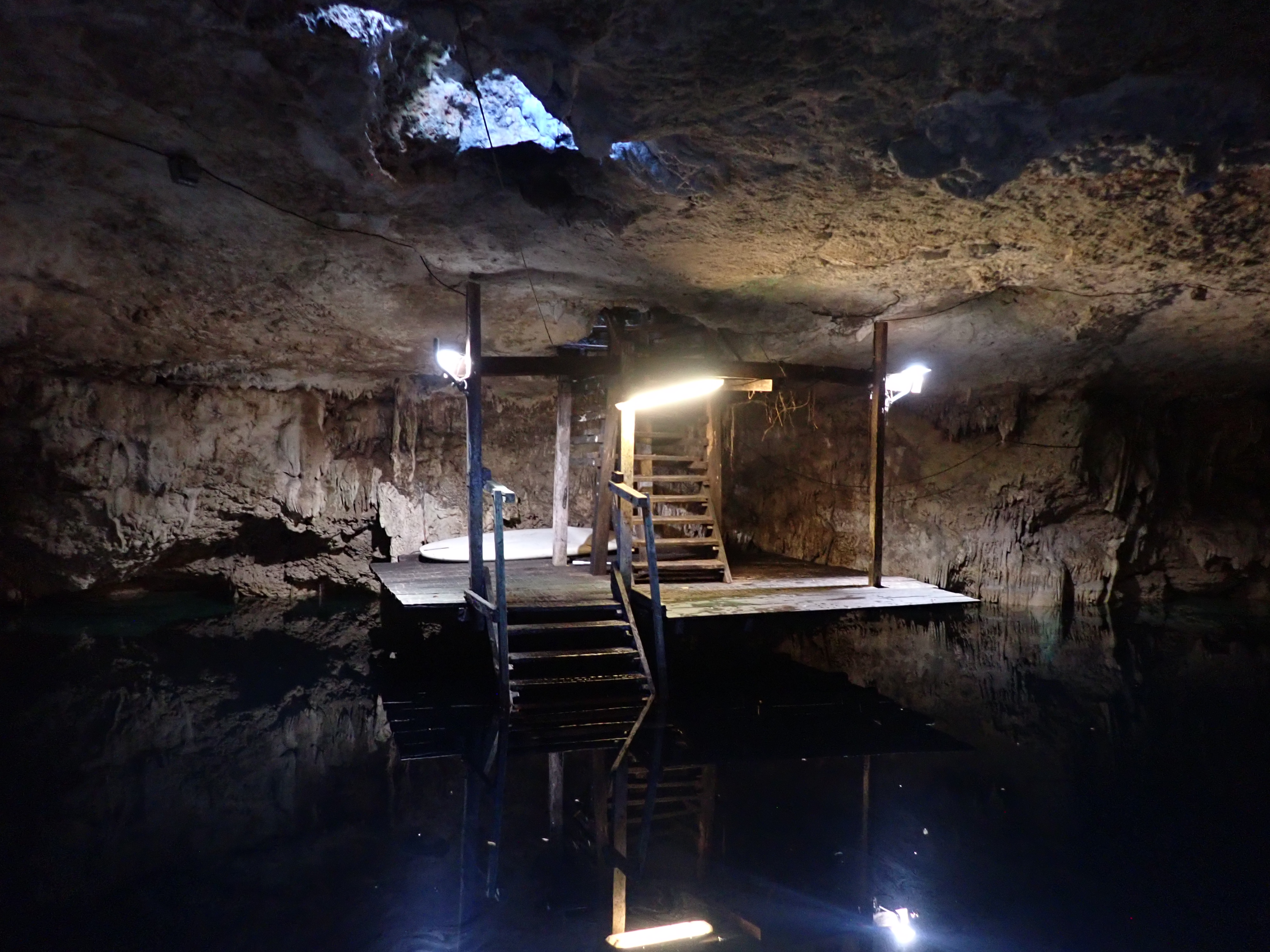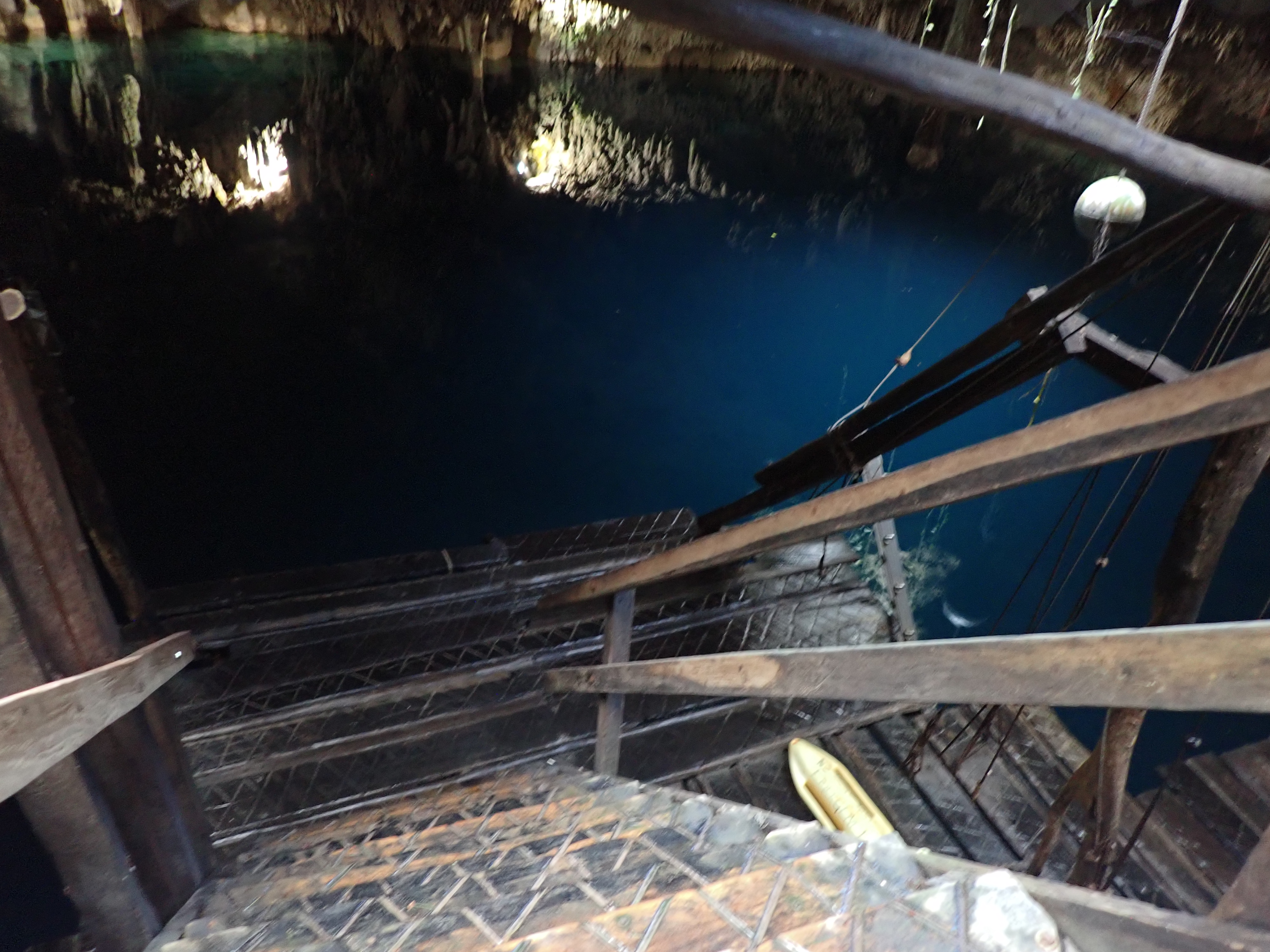 The platform where you can enter into the cenote water. There are underwater lights, the water was turquoise. Can’t tell from the picture.