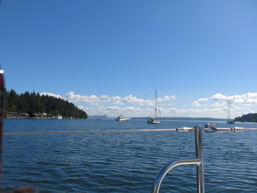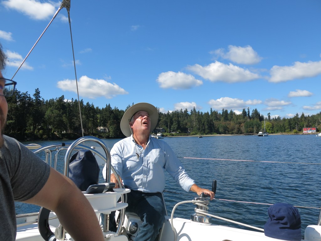 Captain Scott, is a pilot, a lawyer, and worked in Seattle. He sailed to work, in downtown Seattle. It took about an hour. We’re very pleased to charter with him. He answered our sailing questions. Chris impressed me on knowing all the lingo. He showed Chris around the boat, the engine, and the sails, he explained everything. Chris helped manage the sails.