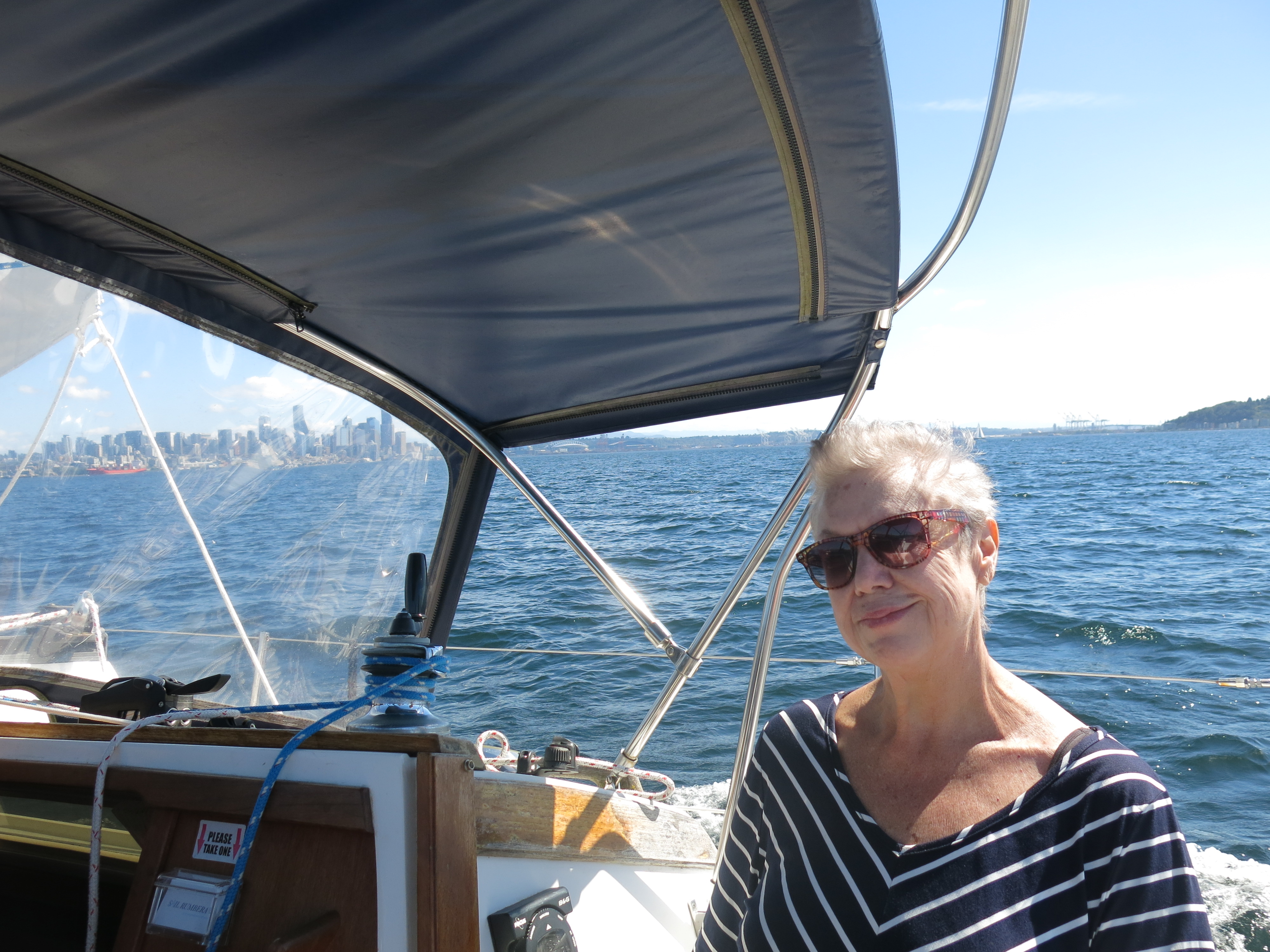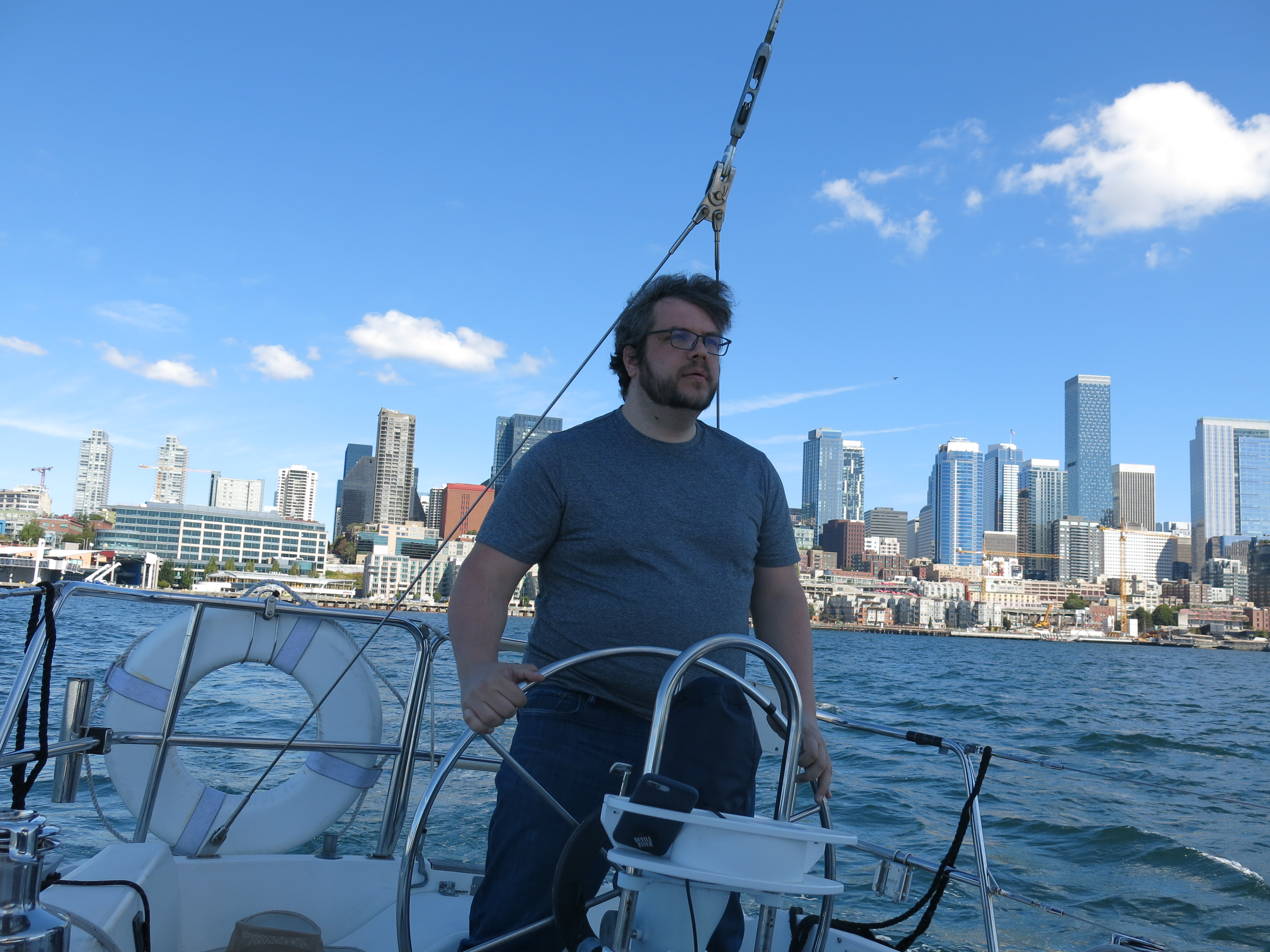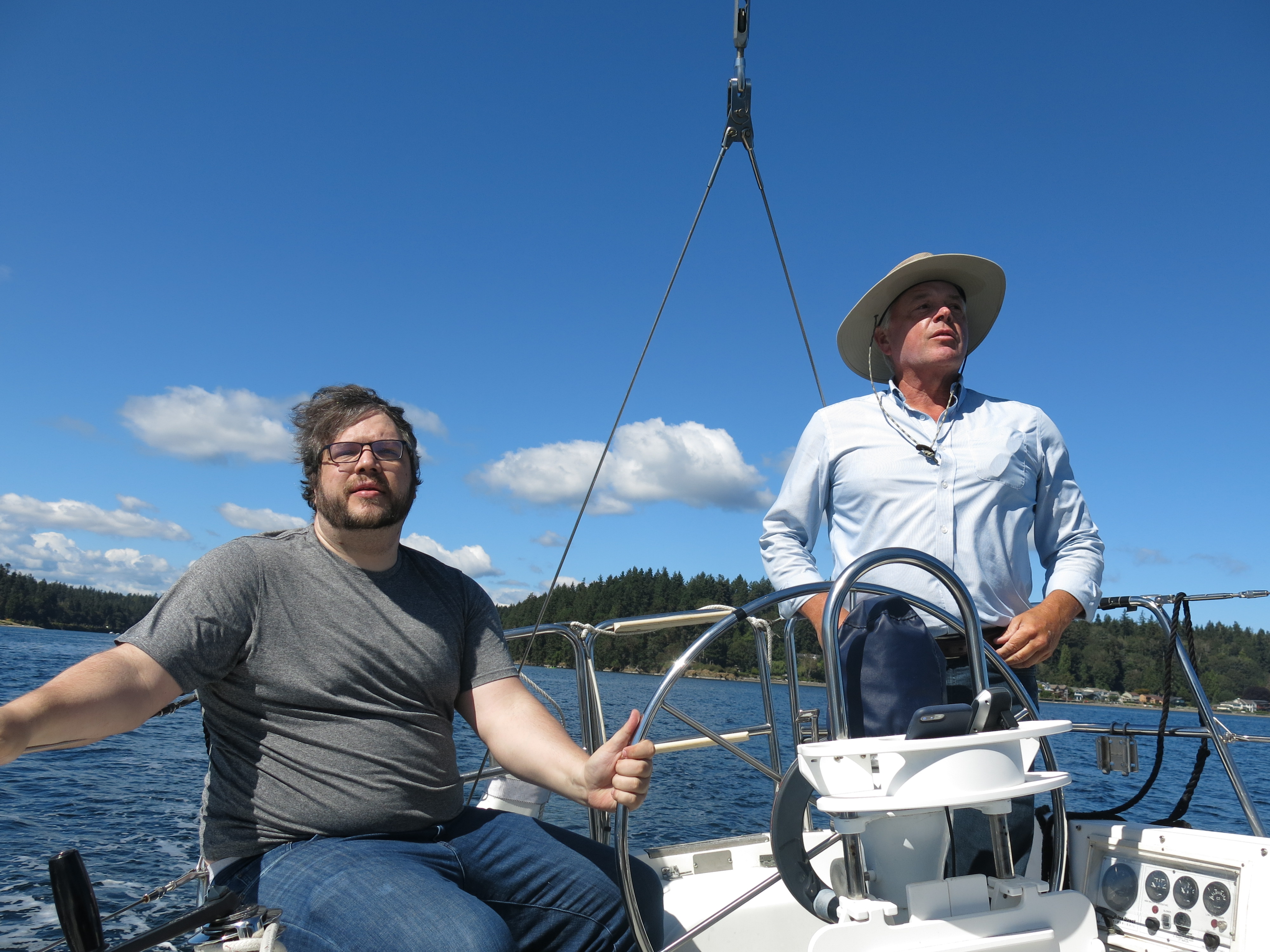 Captain Scott, is a pilot, a lawyer, and worked in Seattle. He sailed to work, in downtown Seattle. It took about an hour. We’re very pleased to charter with him. He answered our sailing questions. Chris impressed me on knowing all the lingo. He showed Chris around the boat, the engine, and the sails, he explained everything. Chris helped manage the sails.